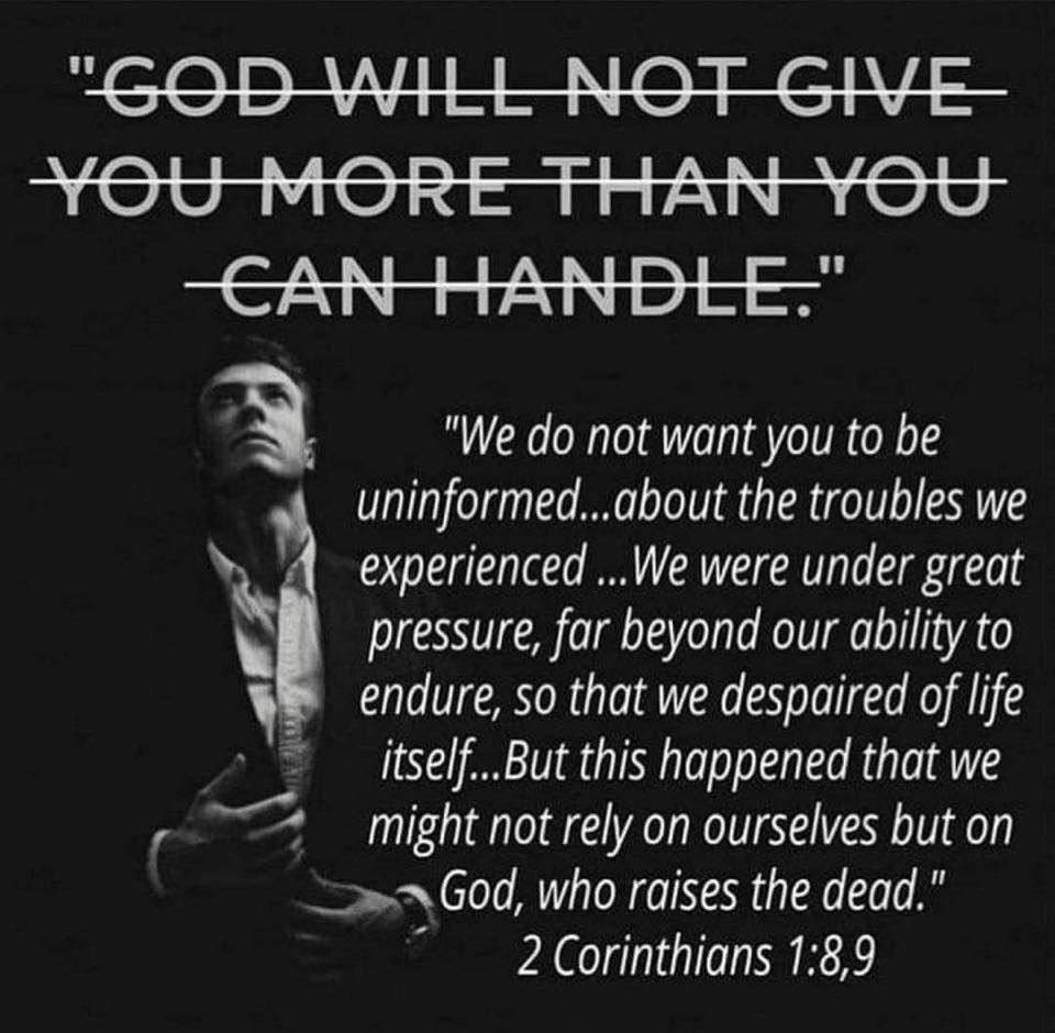 For too many years, this was something I shared to encourage others, never once realizing the weight of this mistruth. You see, it isn’t Truth at all! Biblically, this quote bears no weight. The heaviness comes from knowing what I shared was misleading. The real Truth is, God DOES give us more than we can handle! If He didn’t, we would have no real need for Him! Personally, I am thankful for a God so loving that He does, so that I can rely on His strength and not my own- because THAT is not enough! But HE is! 🙌🏻 One of the beauties of His love is that in Him we find His mercies are new every day! Therefore, I need not allow that weight to stick with me- but the reminder does, of the importance to be in and know the Word of God so as not to be fooled by “Christian” quotes that sound good but are not grounded in Biblical Truth. As Women of Faith, our desire is to lead others to Christ- and we don’t need feel good answers to do that, just Jesus! I beckon you to join me at His feet as we relinquish any and all of our own strength to Him❣️